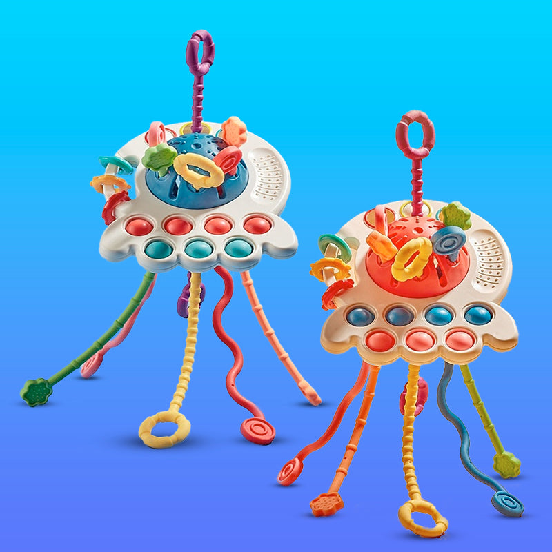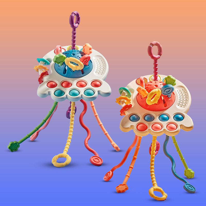 🌌 Aparência legal de OVNI:  Este brinquedo de viagem Montessori foi projetado na forma de um OVNI para estimular a curiosidade e a imaginação do seu bebê. A combinação de cores ricas e brilhantes pode promover a cognição de cores do bebê e atrair a atenção do bebê. A corda puxada para cima e para baixo pode incentivar o bebê a desenvolver habilidades motoras finas e capacidade de coordenação mão-olho para que o bebê possa mergulhar no mundo dos jogos educativos.
